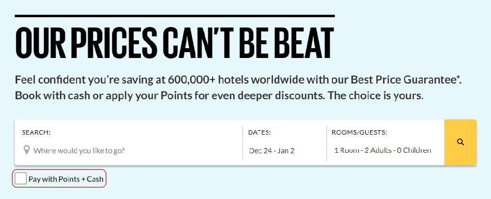 When searching for hotels, we encourage you to select "Pay with Points + Cash" for the best savings. When using the points this way, you can unlock additional savings by using your points. The value you receive for your points does vary, but can often be as high as $30.00/1000 points, and on rare occasions even higher!